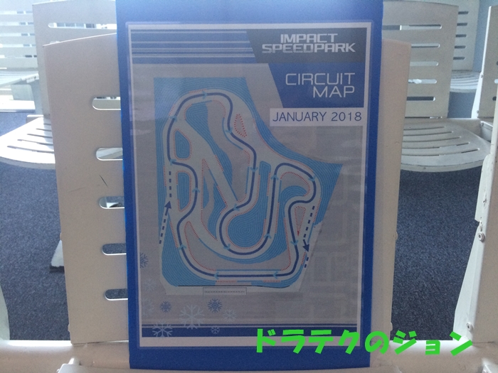 これがインパクトスピードパークのサーキット図。毎月レイアウトが変わるみたいやで。常連さんを飽きさせないようにする配慮かな?