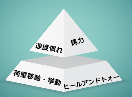 土台となるのは、「荷重移動・挙動」「ヒールアンドトォー」この2つがしっかりできてから「速度に慣れる」「馬力のある車を操る」をしたほうが簡単に乗りこなせるで。