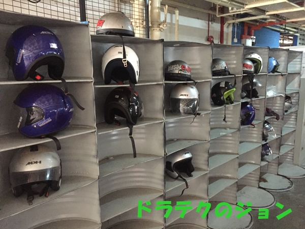 ここでヘルメットを着けるで。ヘルメットを被る前に、清潔なフェイスマスクを貸してくれるからそれを被るで。