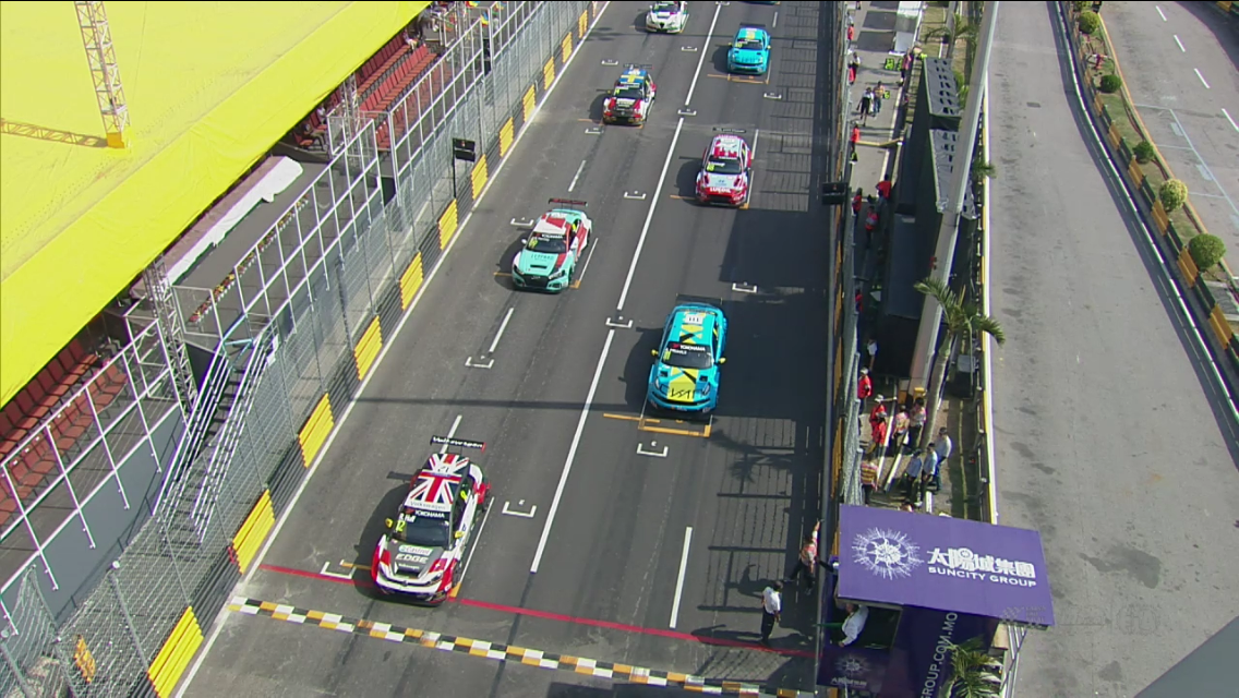 リスボアコーナーを曲がったあとの坂道に向かうレーシングカーを、リスボアカジノの入り口から眺めれれるで。