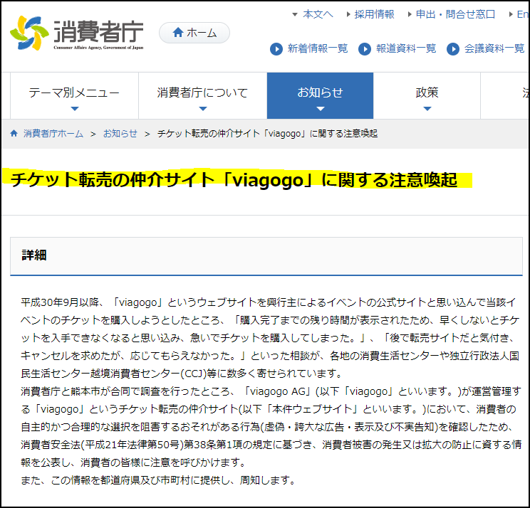 2019年9月、消費者庁が利用者に対しviagogoを利用することを注意喚起を発表してるねん。